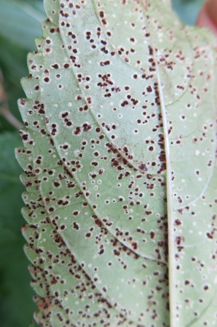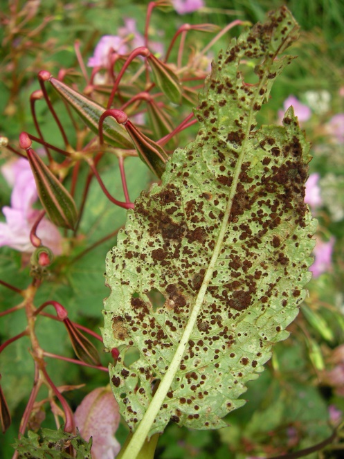 Rust fungus pustules on Himalayan balsam leaves