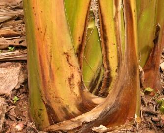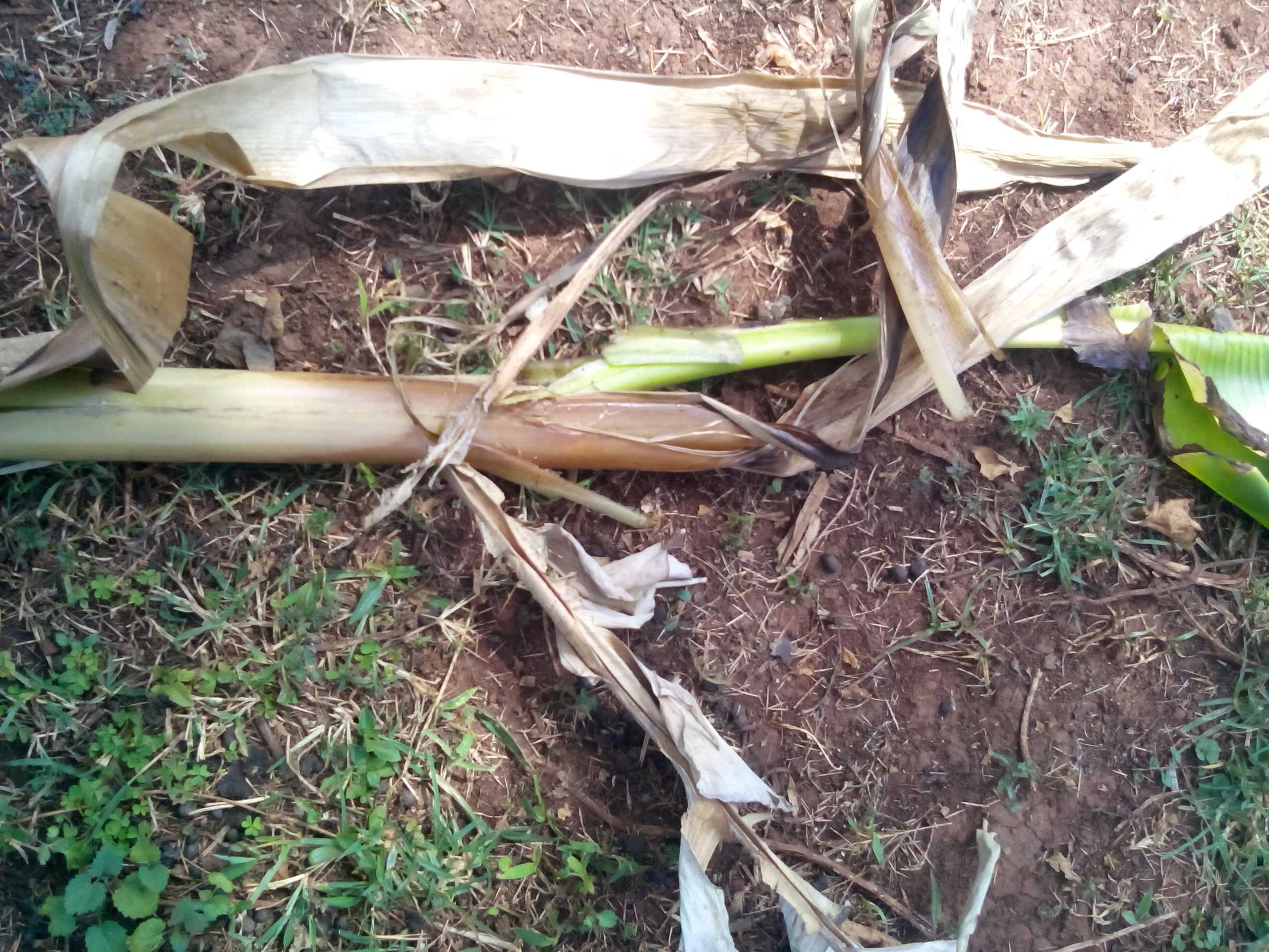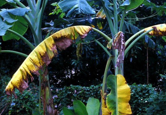 Symptoms of TR4 infection in bananas include yellowing of plant leaves and stems, rotting of internal tissue, necrosis of plant parts and in severe cases, plant death (© David Jones, CABI and Francis Nduati)